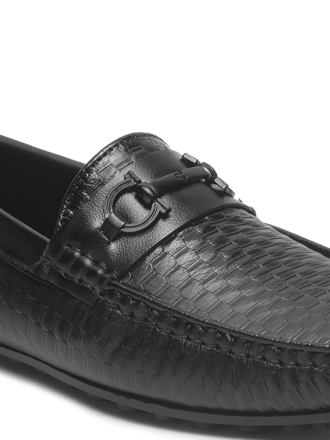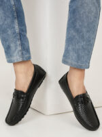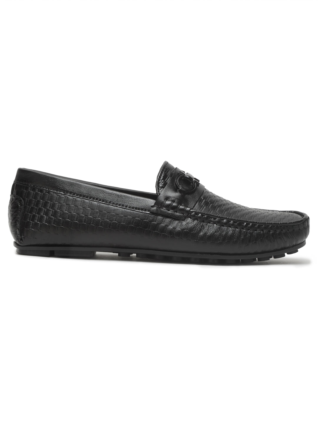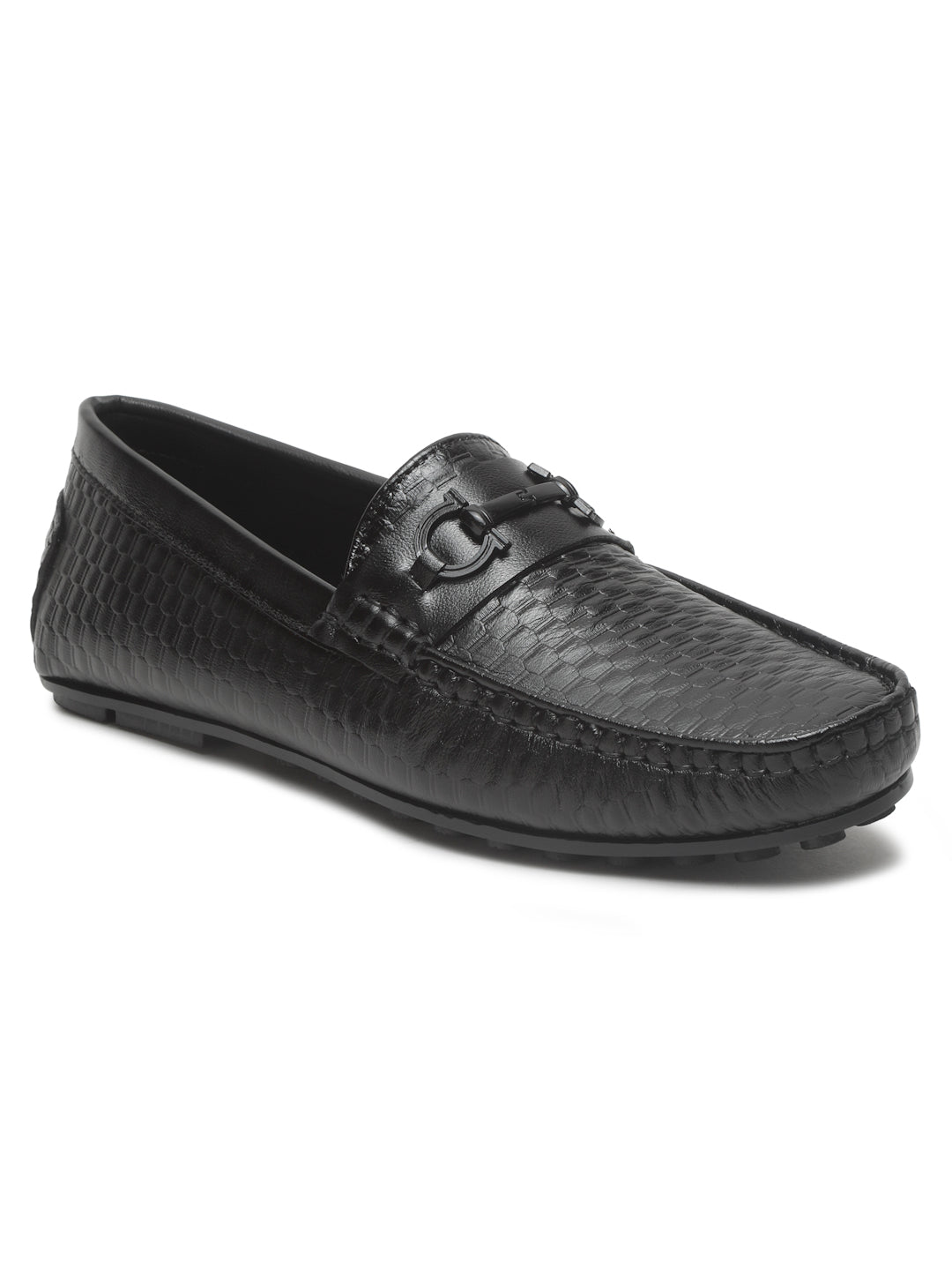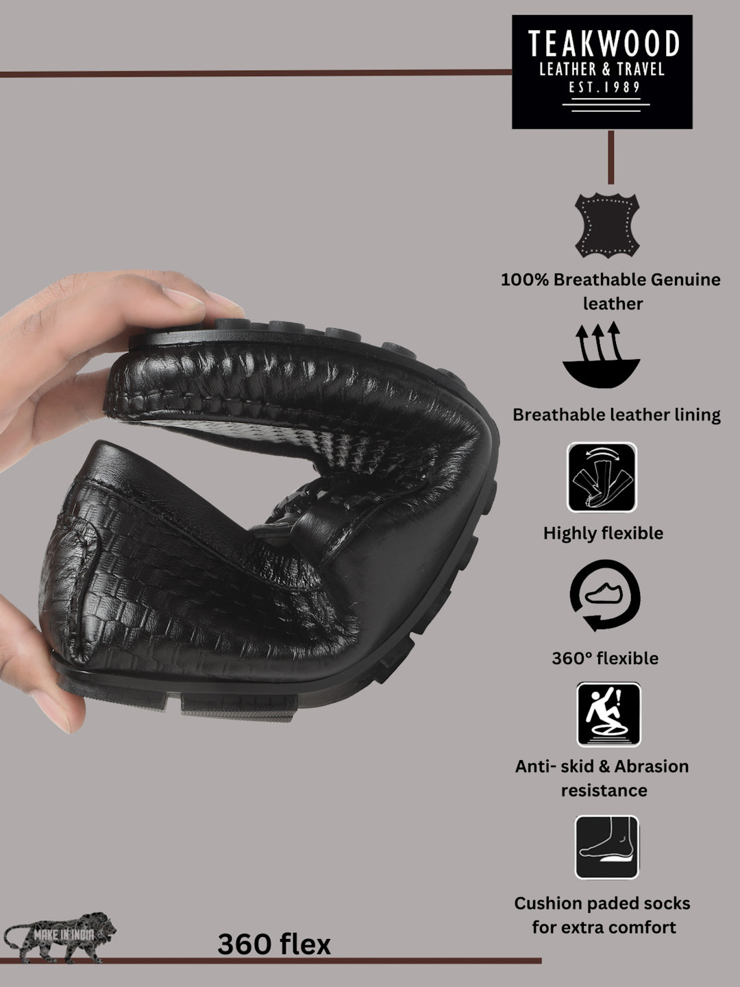 Details: This Teakwood pair of Black texture Leather Flexi 360 Loafers has slip-on with buckle details. It has round toed. anti-skid with a flexible sole. has Cushioned footbed for extra comfort and highly flexible.